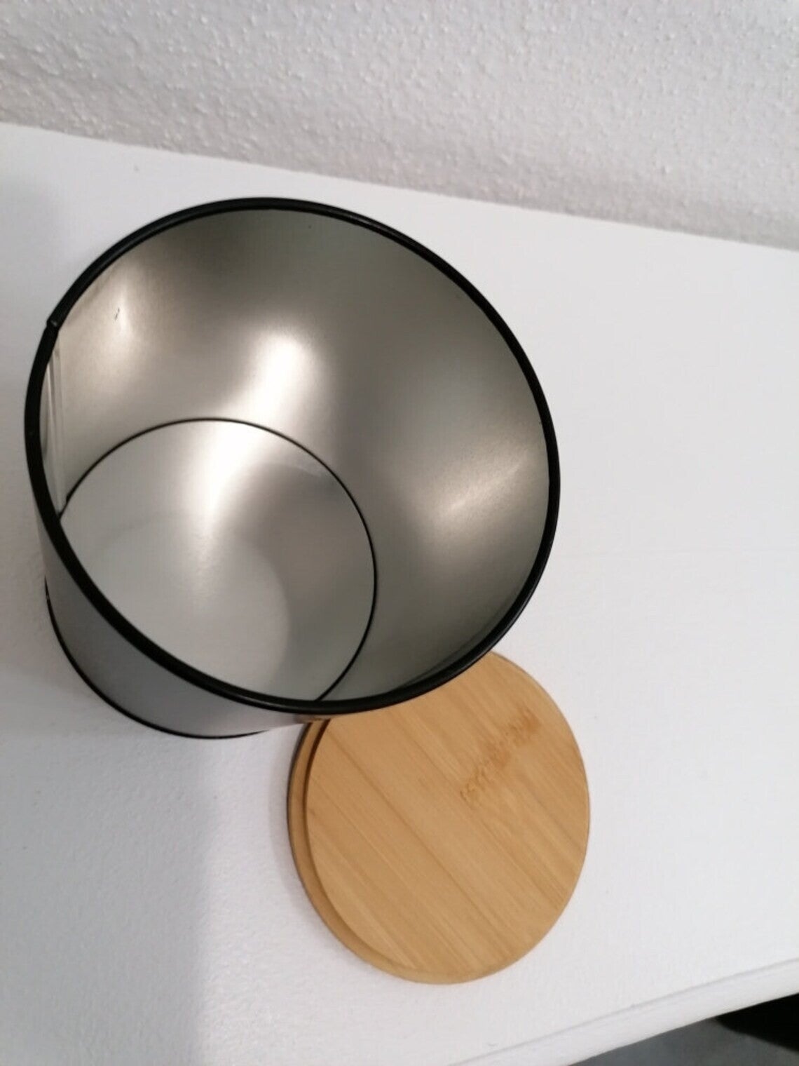 Boîte, bocal, bocaux en métal noir à l'extérieur, argenté à l'intérieur.