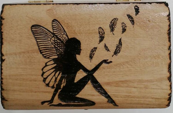 Coffret de rangement gravée d'une fée et d'une envolée de plumes.