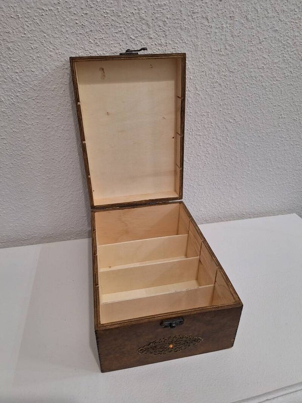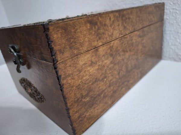 1 ornement en métal bronze orne l'avant de la boîte.