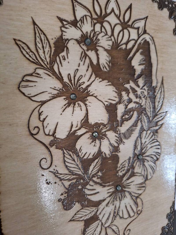 Boîte en bois gravée d'un loup et fleurs loup boite haute huiles essentielles photos bijoux pierres cristaux, courrier, boite souvenir