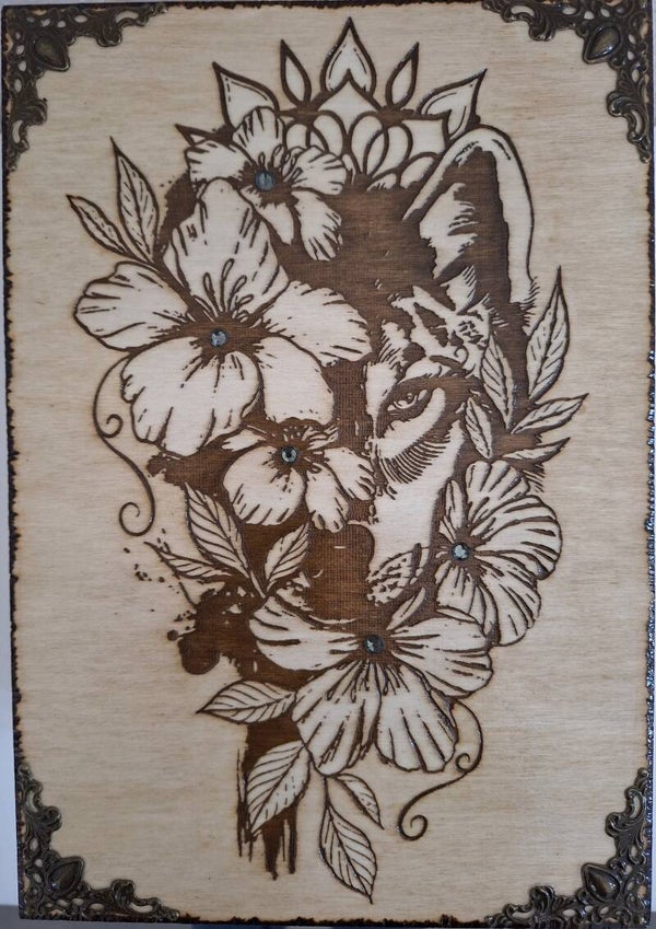 Gravure totem sur le loup avec un effet relief sculpté dans le bois, les fleurs sont ornés de strass en verre couleur anthracite.
