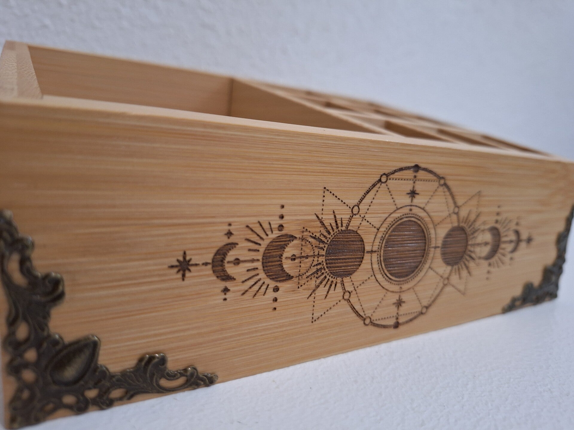 Organiseur en bois maquillage salle de bain gravé phase de la lune ou cycle lunaire, rangement bureau accessoires