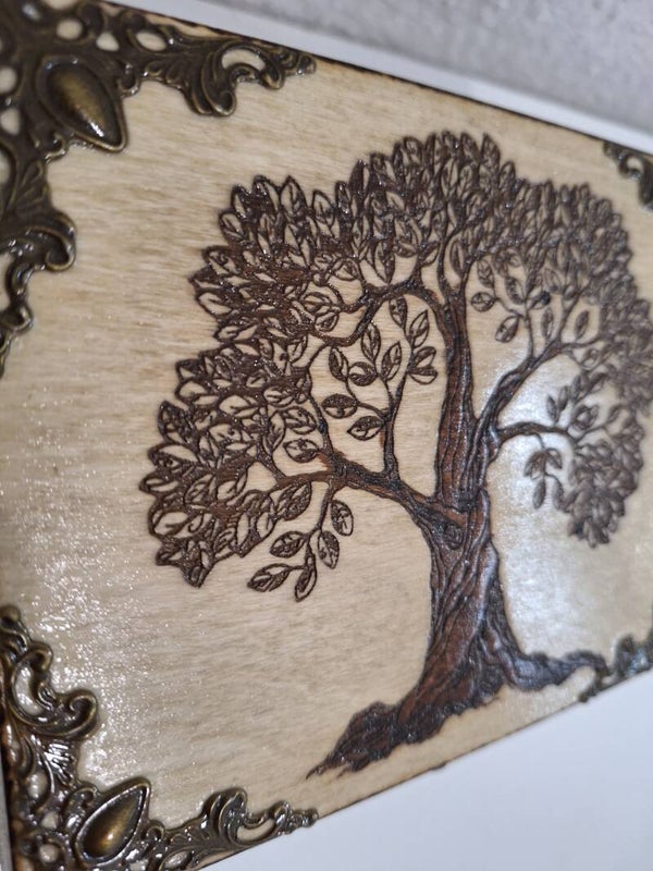 Coffret en bois gravée arbre olivier thé bijoux pierres cristaux huiles essentielles 2 compartiments