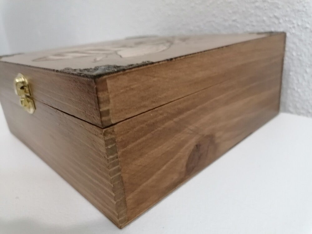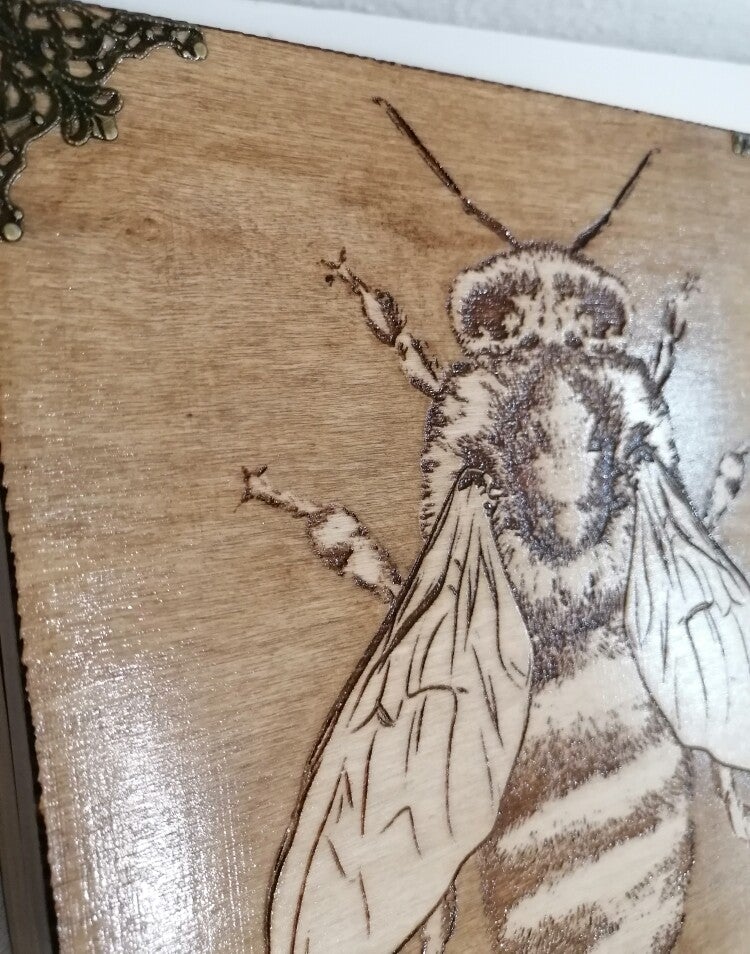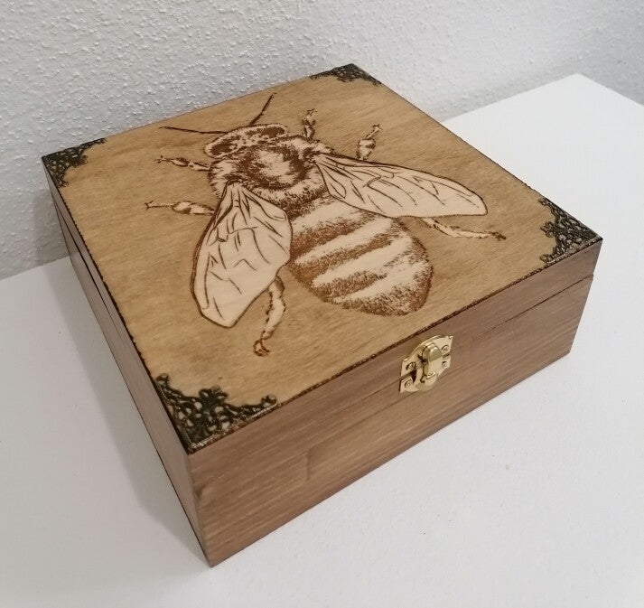 Boîte en bois gravée abeille et bronze rangement miel, pollens, gelée royale, savon, huile essentielle, bonbon, propolis, thé, bijoux