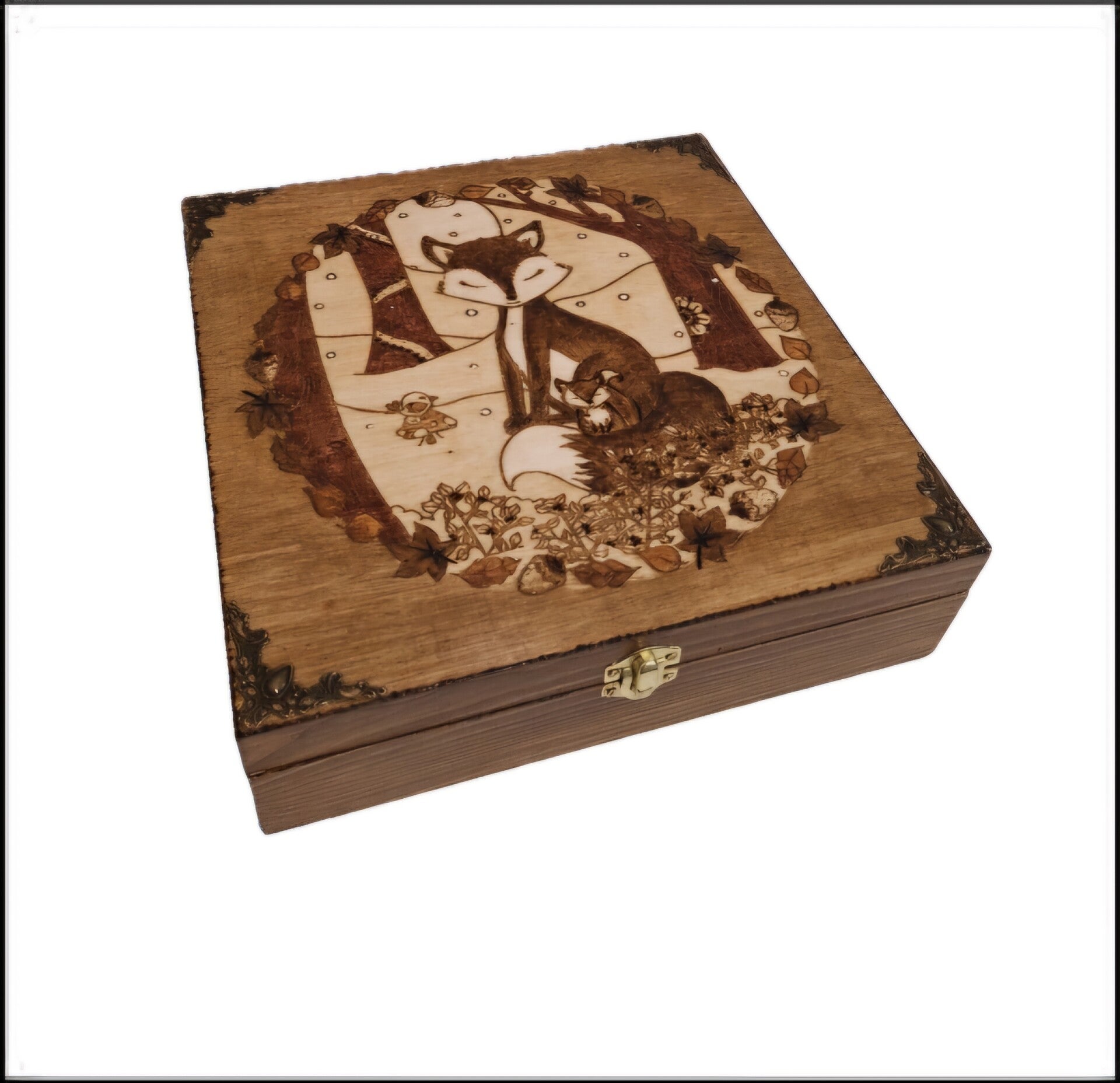 Boîte en bois gravée de Mme Renarde et son petit sur une décoration automne hiver.