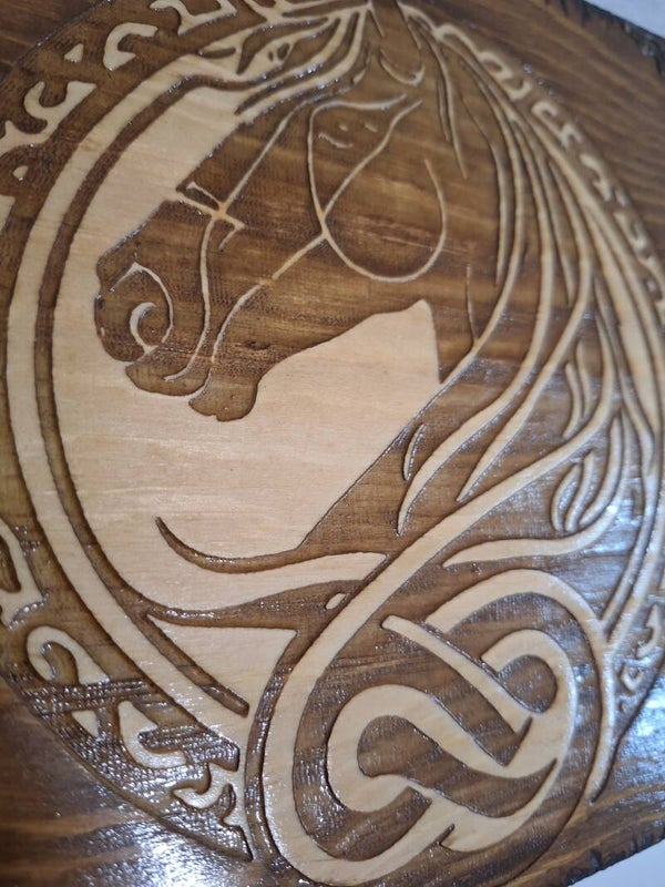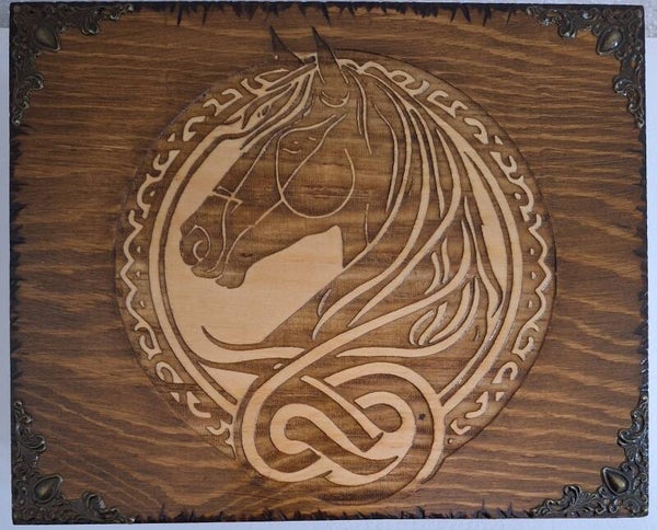 Coffret en bois gravée d'un cheval celtique boite avec ornement de crinière en noeuds celtes