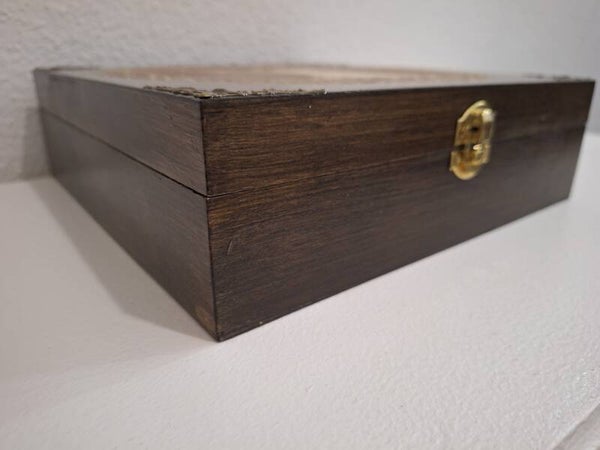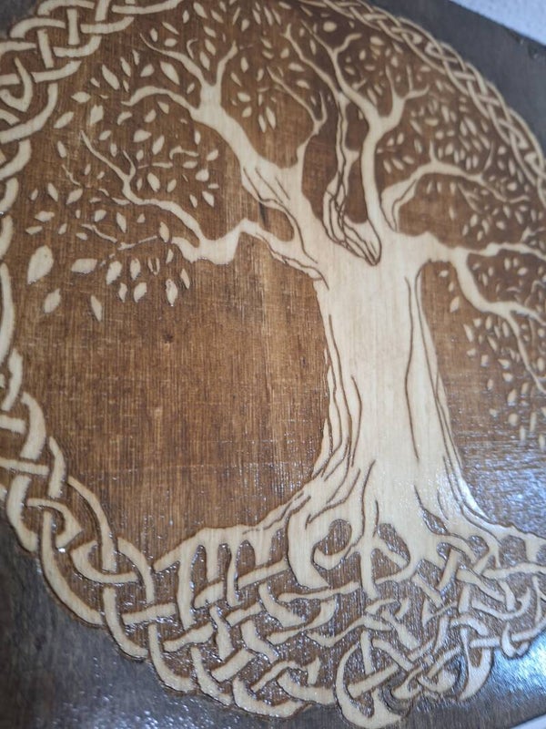 Boîte de rangement en bois, gravée d'un arbre de vie celtique couronné par mes soins.