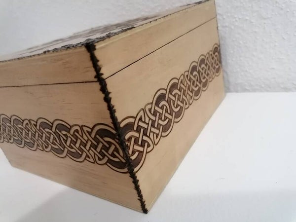 Tous les côtés de la boîte sont gravés de noeuds celtiques.