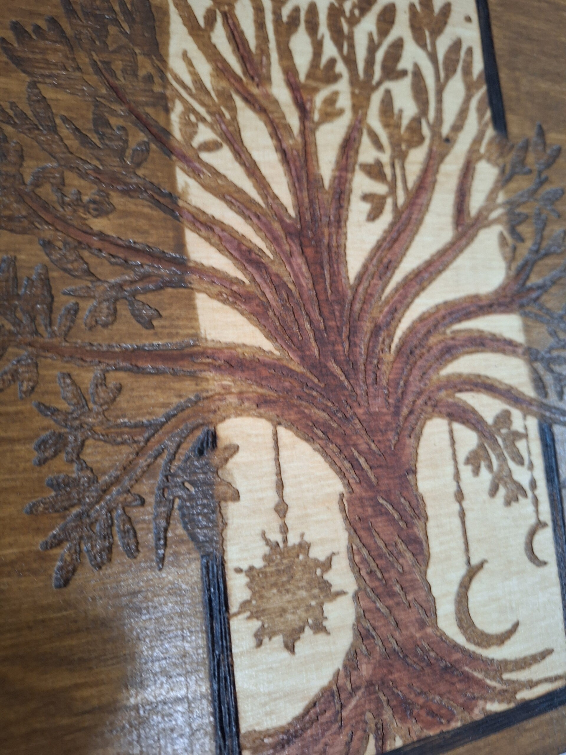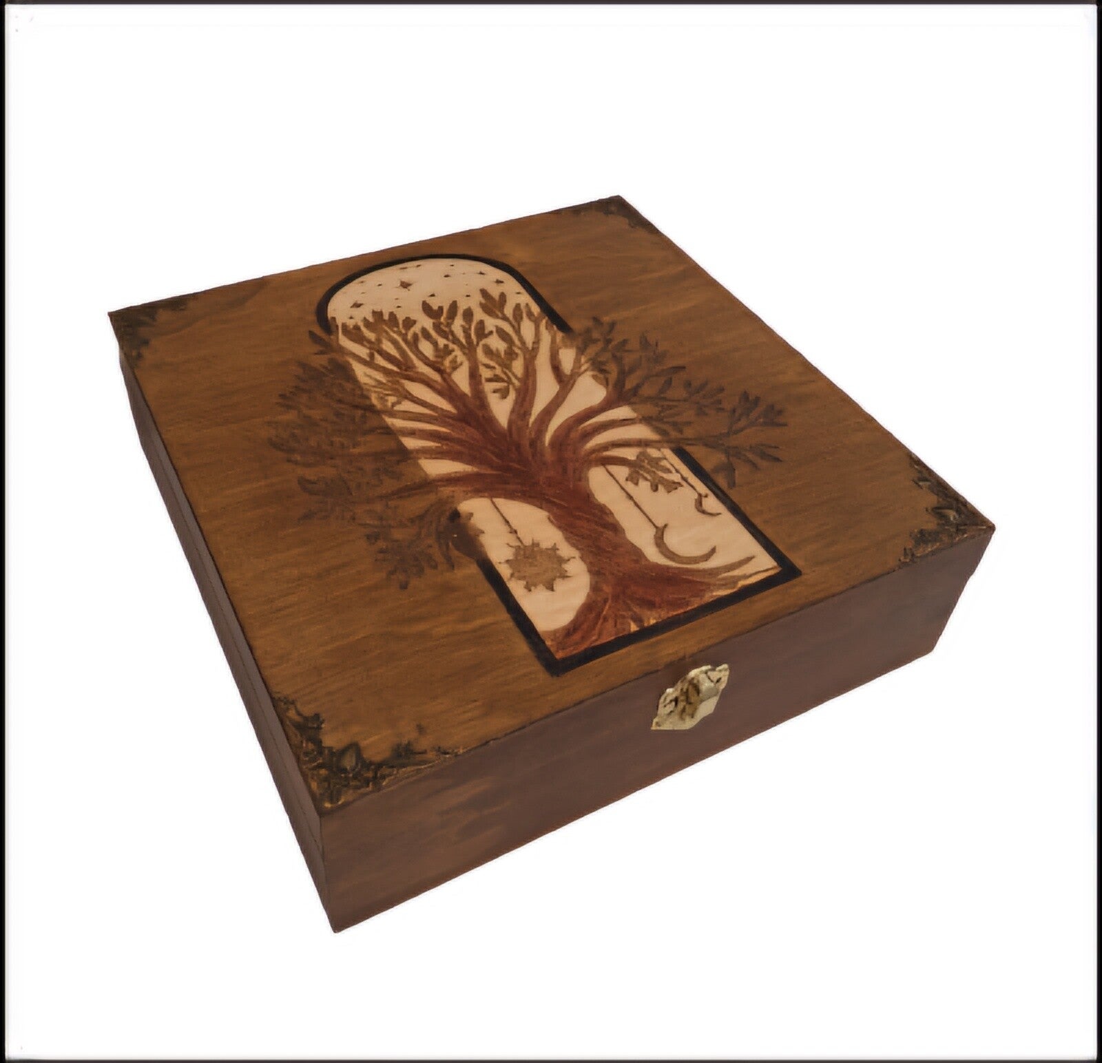 Boîte en bois gravée d'un arbre de vie celtique avec soleil, lune et étoilés sur fond de porte céleste.
