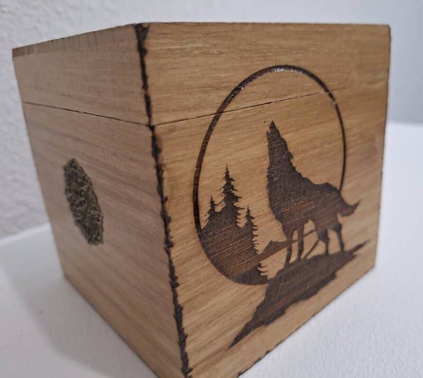 Boite gravée de loups et empreinte Boite carré en bois sur le thème de la nature sauvage loup hurlant à la lune et totem loup