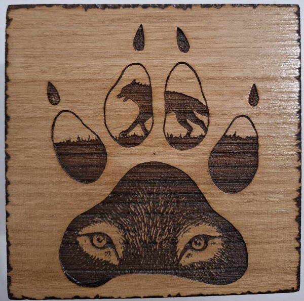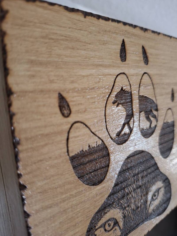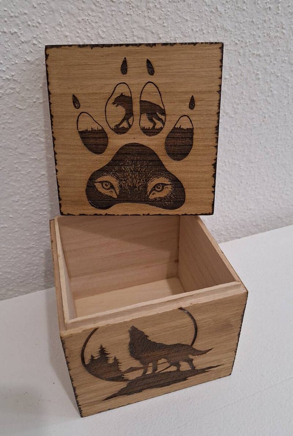 Boîtier de rangement en bois gravée d'une empreinte de loup avec un fondu de regard de loup et profil animal.