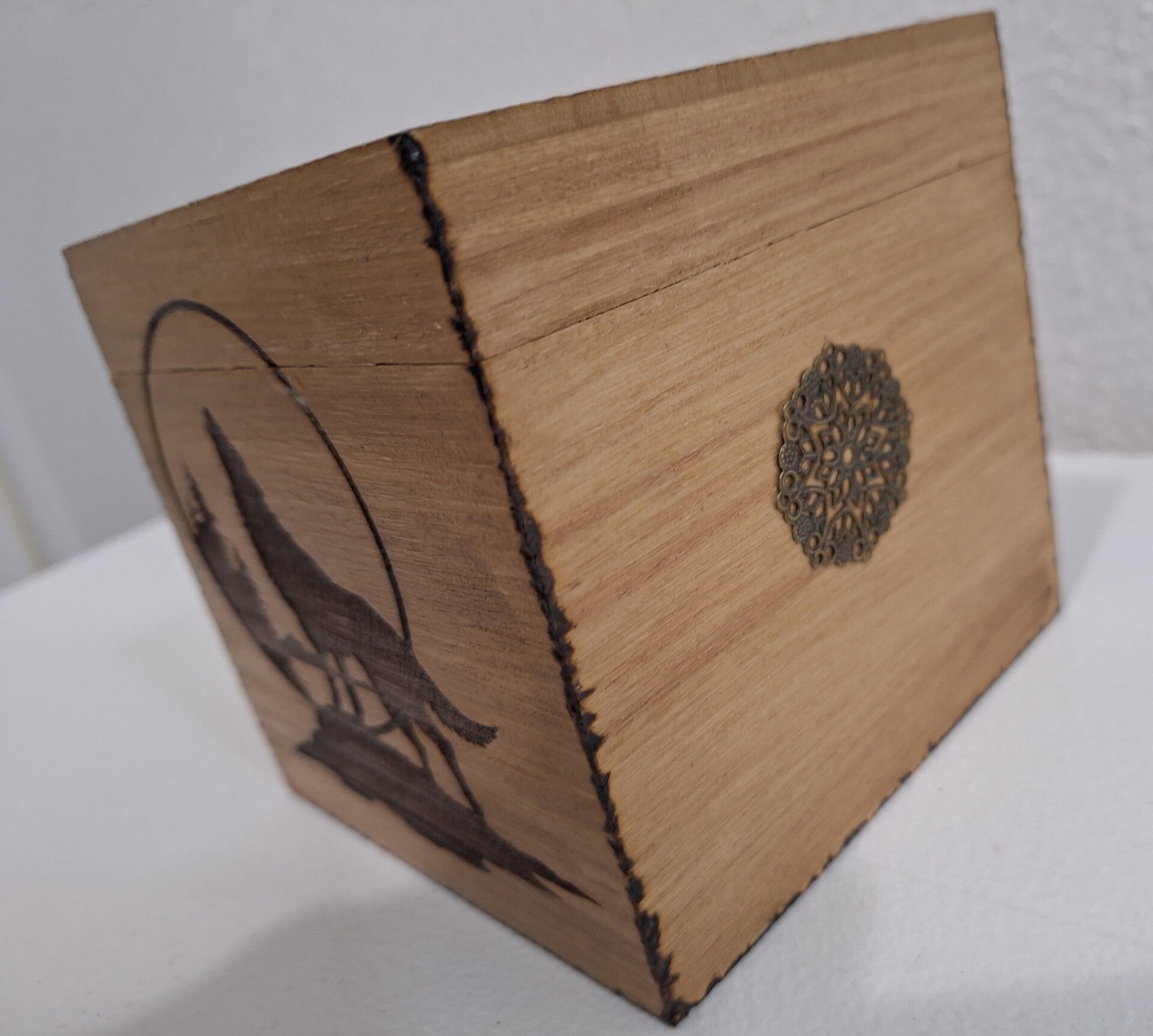 Deux côtés de la boîte sont gravés d'un loup hurlant à la lune.