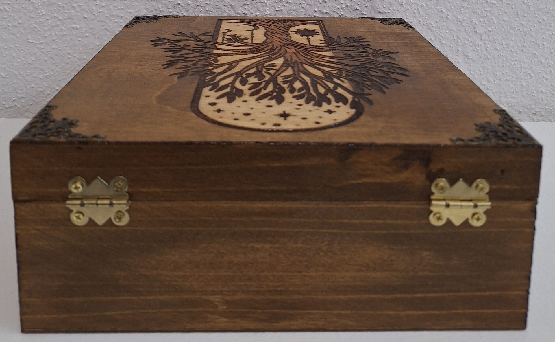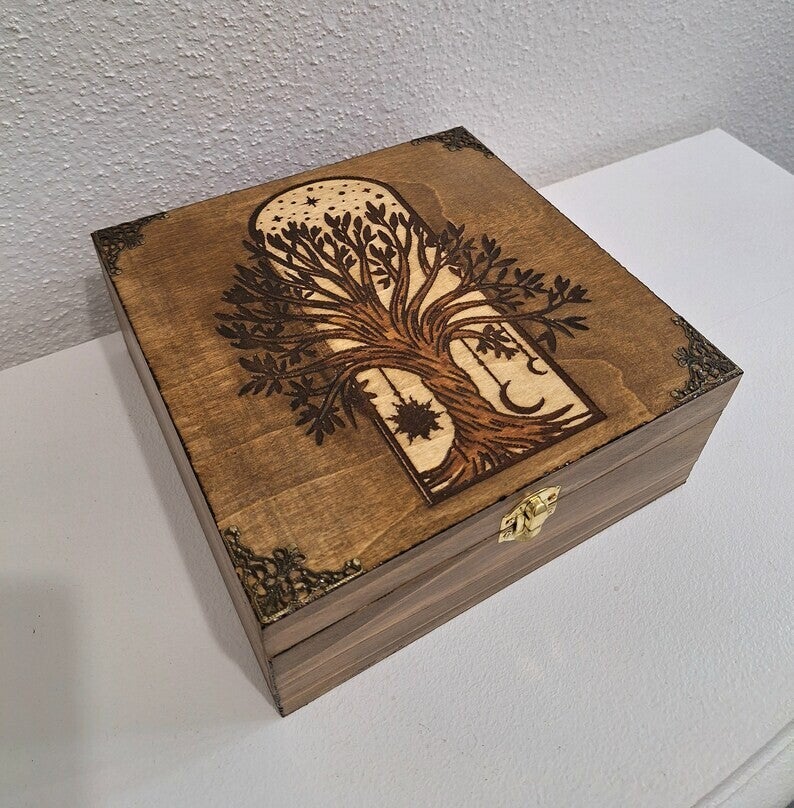 Boîte en bois gravée d'un arbre de vie celtique avec soleil, lune et étoilés sur fond de porte céleste.