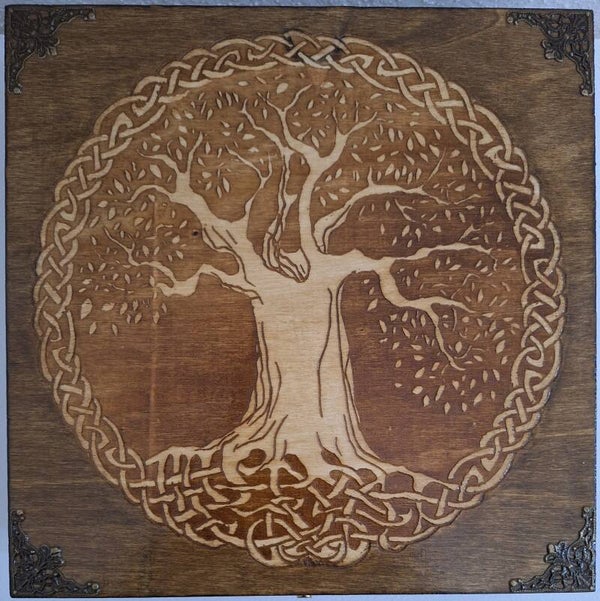 Grande boîte de rangement en bois gravée d'un Arbre de vie celtique couronné bronze pierres cristaux bijoux thé huile essentielle