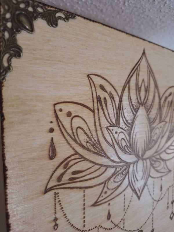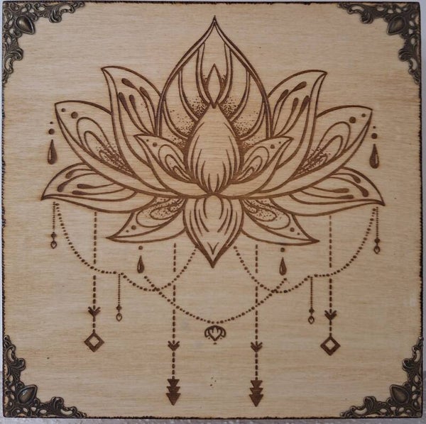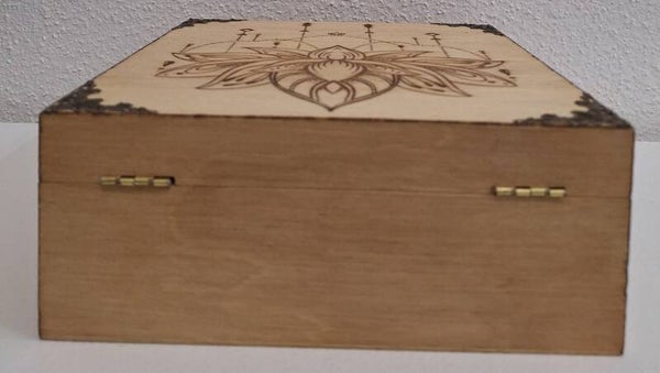 Boîte gravée d'une Fleur de Lotus Nénuphar boite de rangement type boit à huiles essentielles, thé, pierres cristaux, bijoux