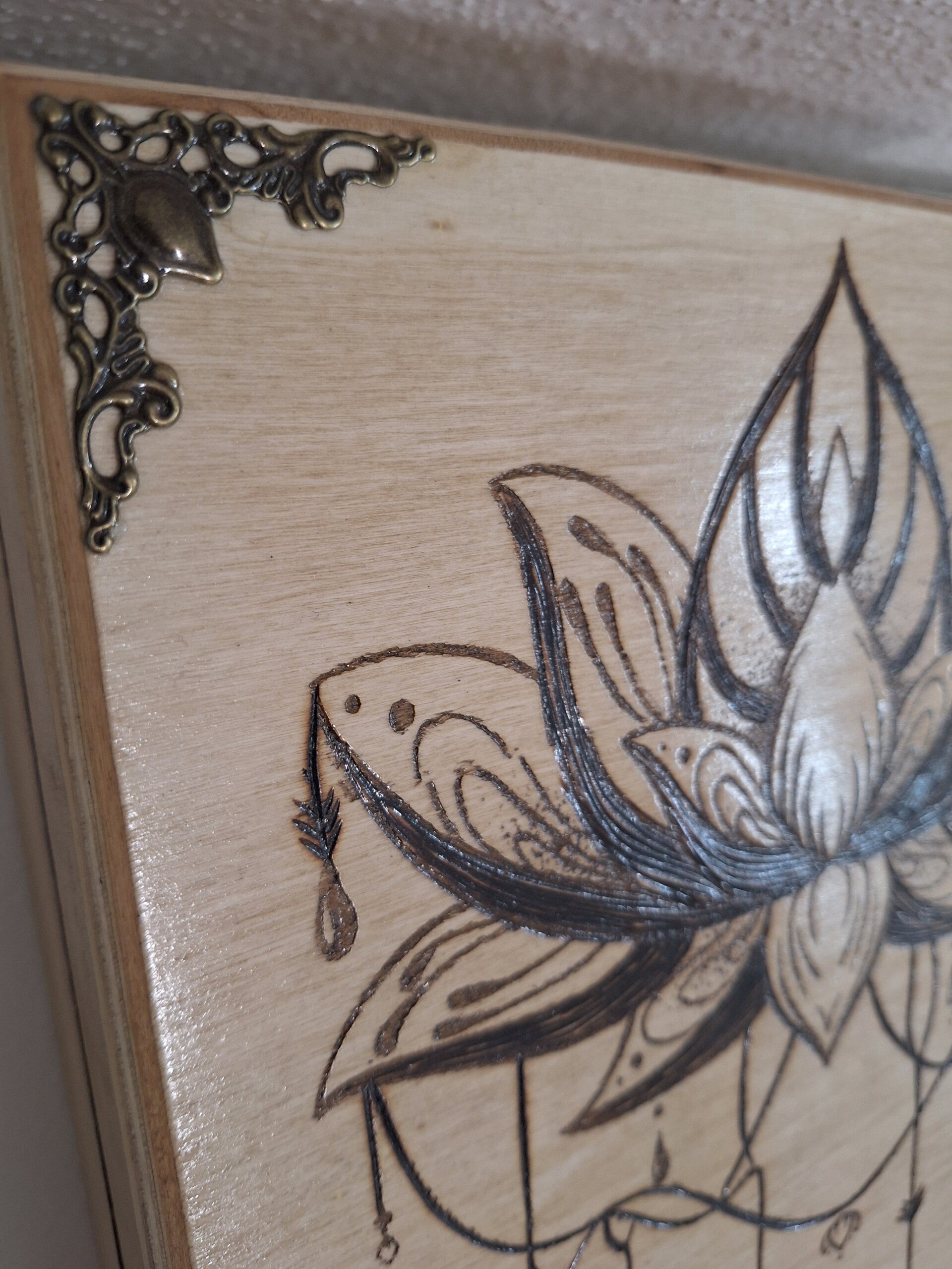 Grande boîte gravée d'une Fleur de Lotus Nénuphar boite de rangement type boite à pierres, cristaux, bijoux, numismate, graines etc...