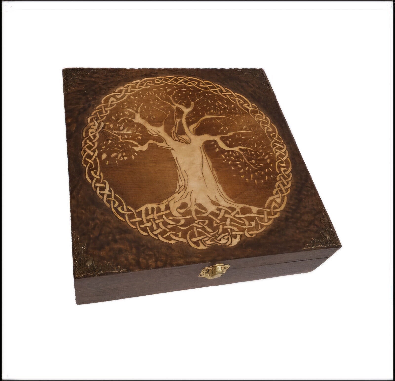 Grande boîte à pierres de rangement en bois de hêtre carrée gravée d'un arbre de vie celtique couronné par mes soins.
