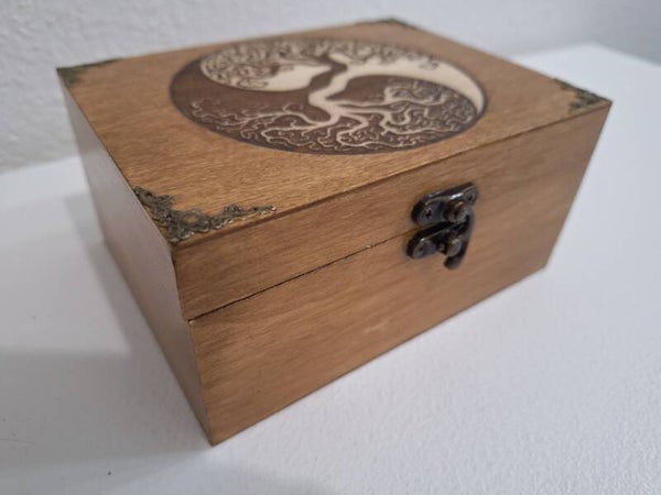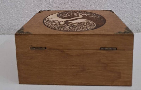 Coffret en bois gravé arbre de vie celtique yin yang avec bronze thé bijoux pierres cristaux 2 compartiments