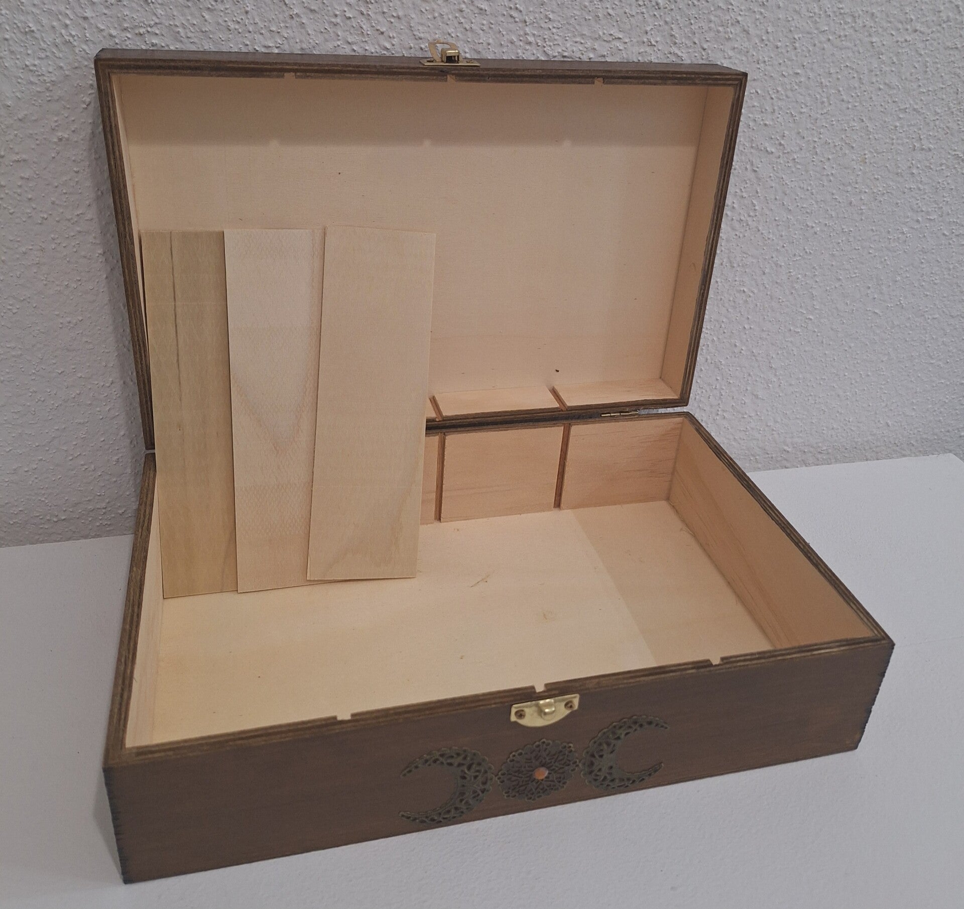 Boîte en bois gravée des différentes phases de la lune lithothérapie huile essentielle thé pierres cristaux
