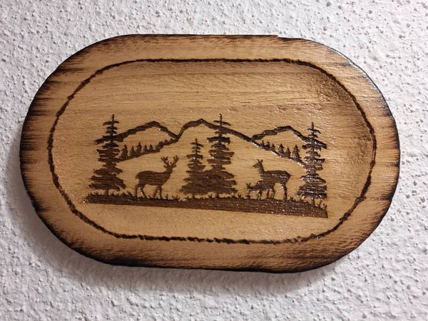 Lot de 3 petits tableaux en bois gravés sur le thème d'hiver à la montagne, décoration de sapins enneigés, de chalets, de cerfs et montagnes