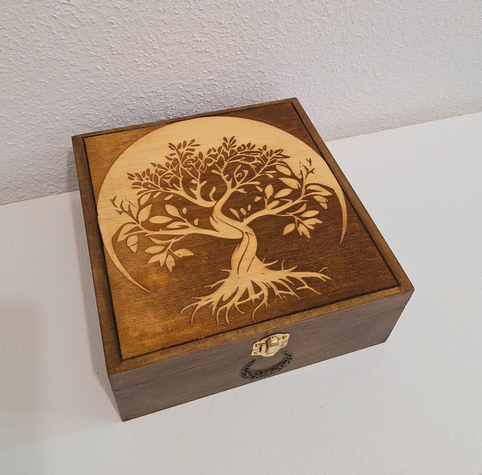 Boîte de rangement en bois de hêtre carrée, gravée d'un arbre de vie celtique sur fond de l'aurore.