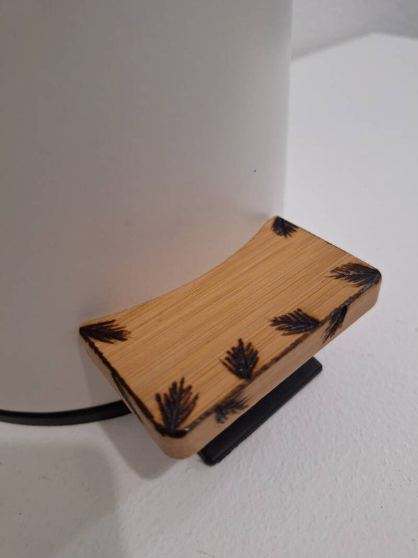Poubelle en bois de bambou gravée d'un sapin pin sylvestre et d'une couronne de branches de sapins.