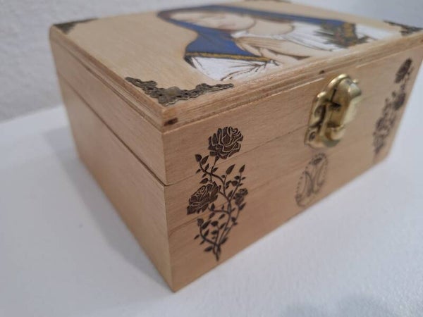 Boîte en bois de hêtre gravée de la Sainte Vierge Marie en prière, pour y rangement vos objets religieux et/ou souvenirs. (Chapelets, custode à hostie, cartes, souvenirs de baptême, communion, confirmation, ordination de prêtre, mariage)