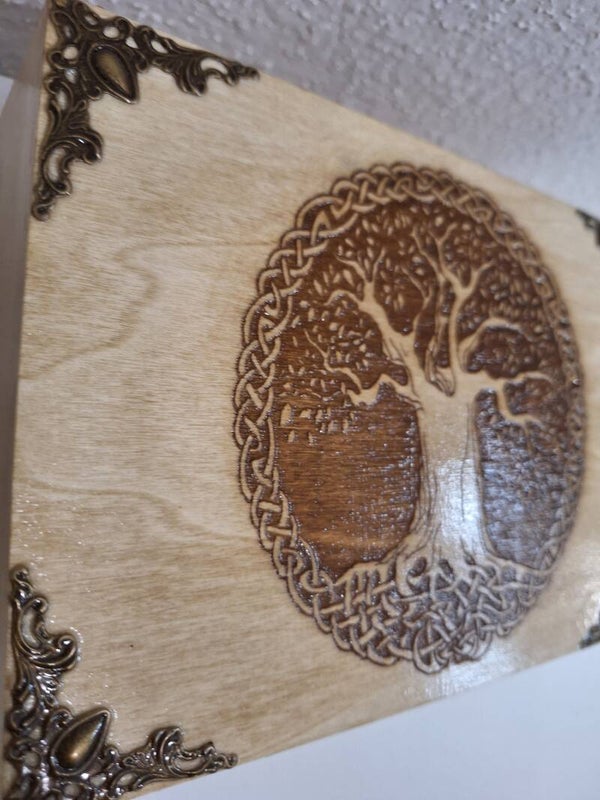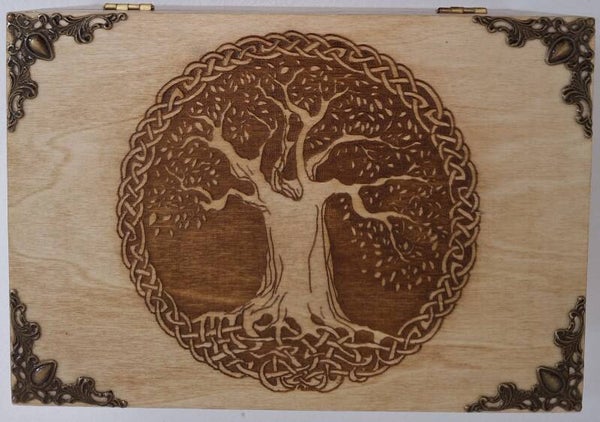 Boîte à thé ou de rangement pour flacon d'huiles essentielles gravée d'un arbre d evie celtique couronné.
