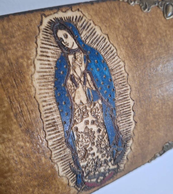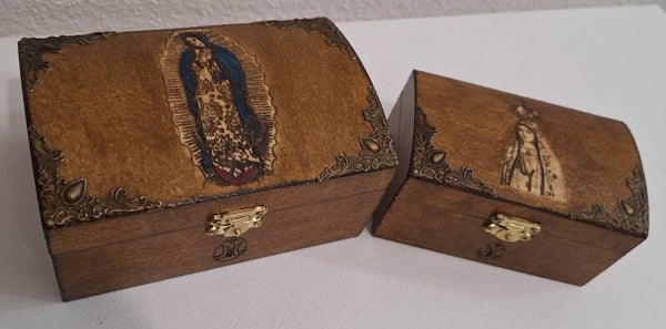 Lot de deux coffrets gravés de Notre Dame de Guagalupe et de Notre Dame de Fatima et du monogramme de la Très Sainte Vierge Marie.