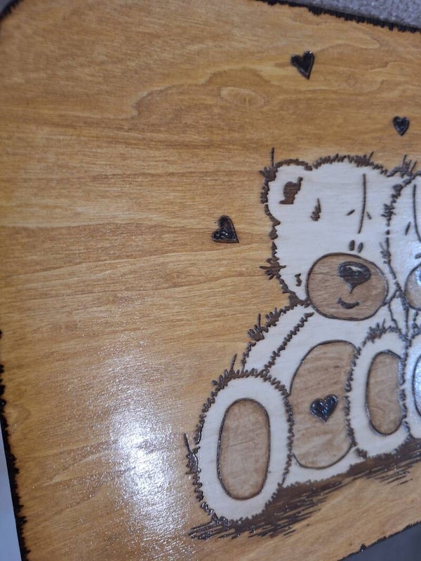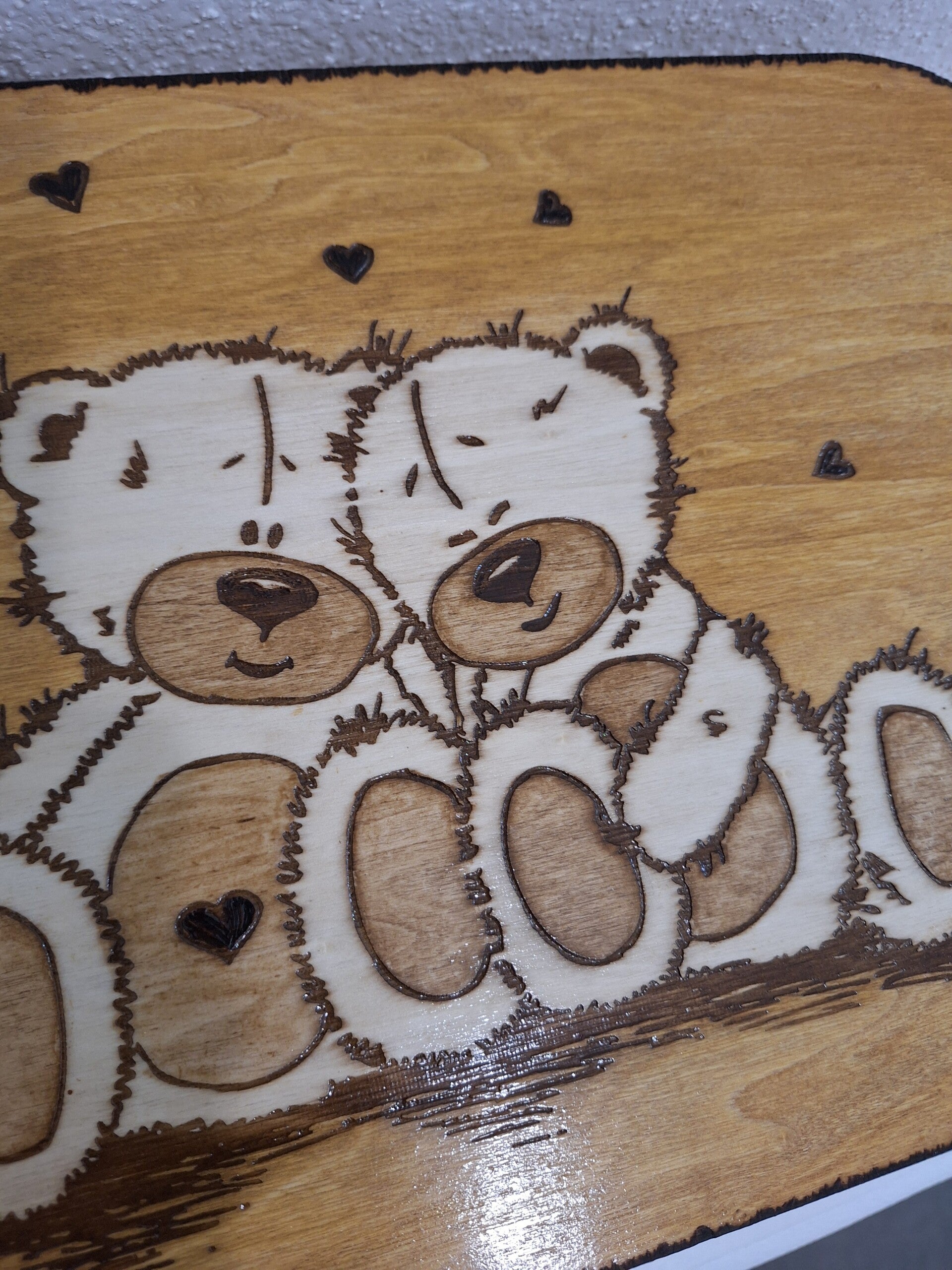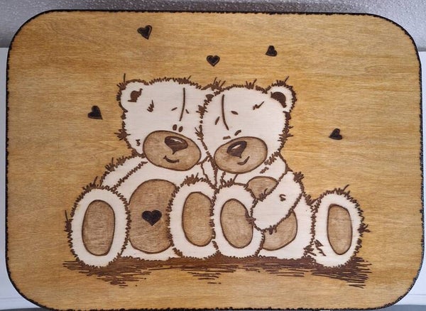 Gravures et peintures réalisées par mes soins représentant deux nounours en peluche.