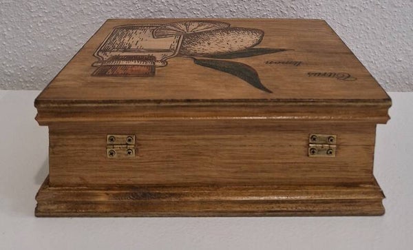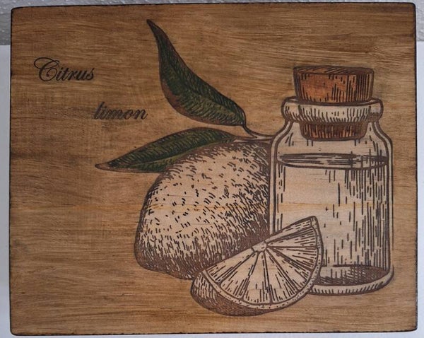 Boîte de rangement huiles essentielles gravée de citrons et d'un flacon Citrus lemon huile labiées