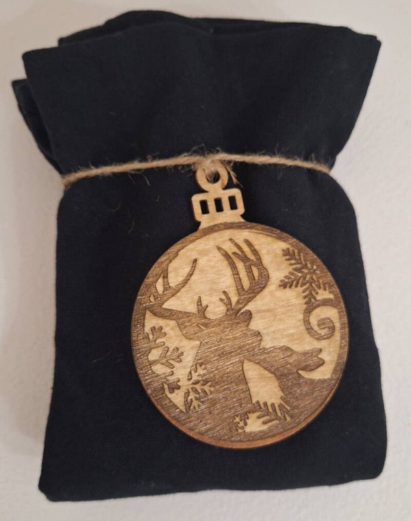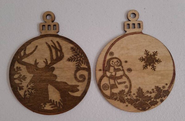 Lot de 2 boules de Noël en bois gravées de cerf, biche et bonhomme de neige.
