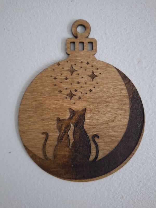 Lot de 2 boules de Noël en bois gravées l'une d'un couple de chats et l'autre d'un flocon de neige.