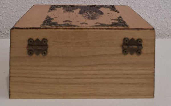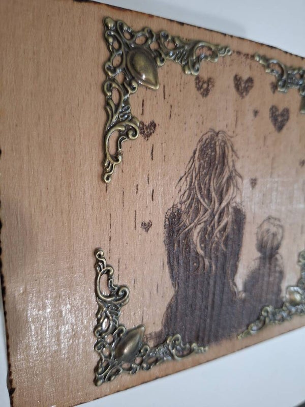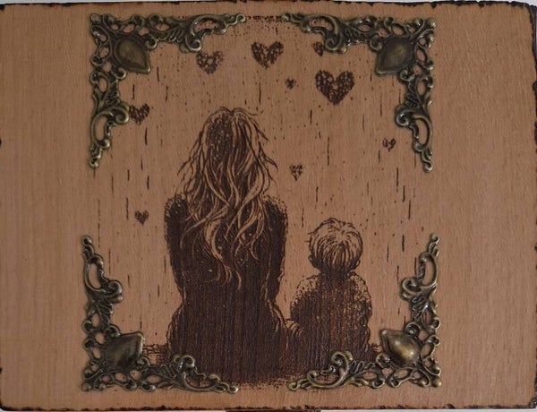 Coffret en bois de peuplier gravé d'un dou Mère & Fils sous une pluie de coeurs.