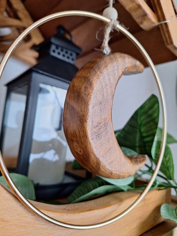 Suspension en bois croissant de lune dans un cerceau boule d'acier Décoration douce et féérique