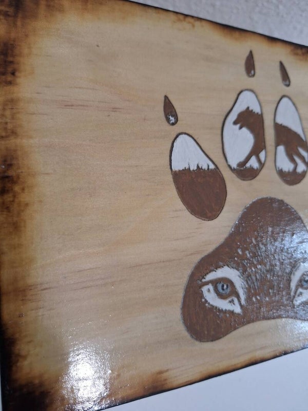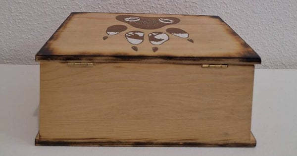 Boite gravée d'un loup avec profil d'empreinte de loup type boite à sucre