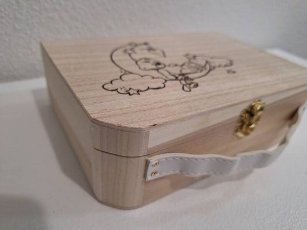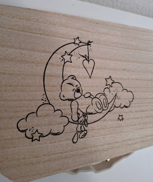 Valise maternité bébé à personnaliser gravée ourson avec sa peluche sur un croissant de lune ou valisette à souvenir avec nounours enfant