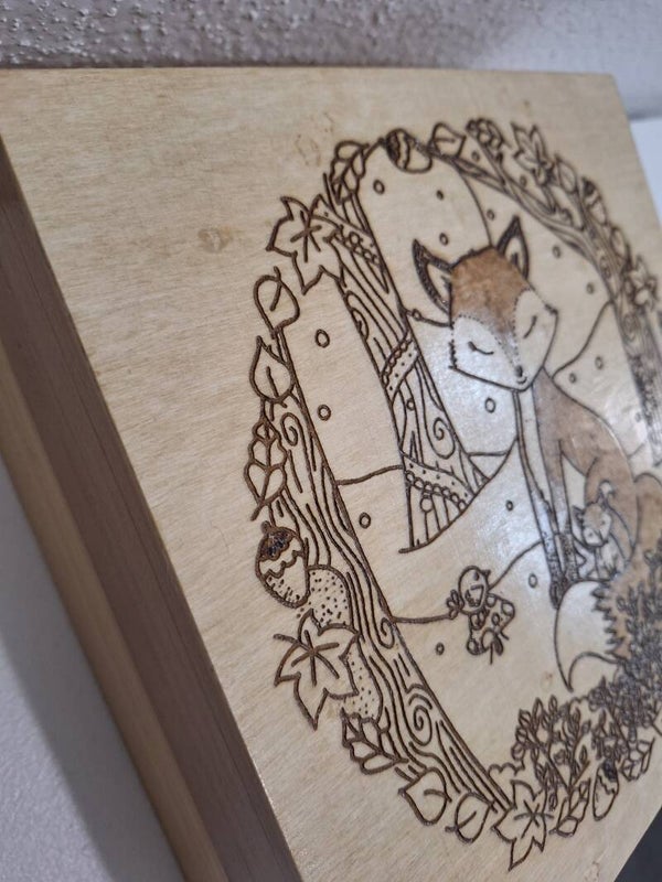 Boîte en bois gravée de Mme Renarde et son petit sur une décoration automne hiver.