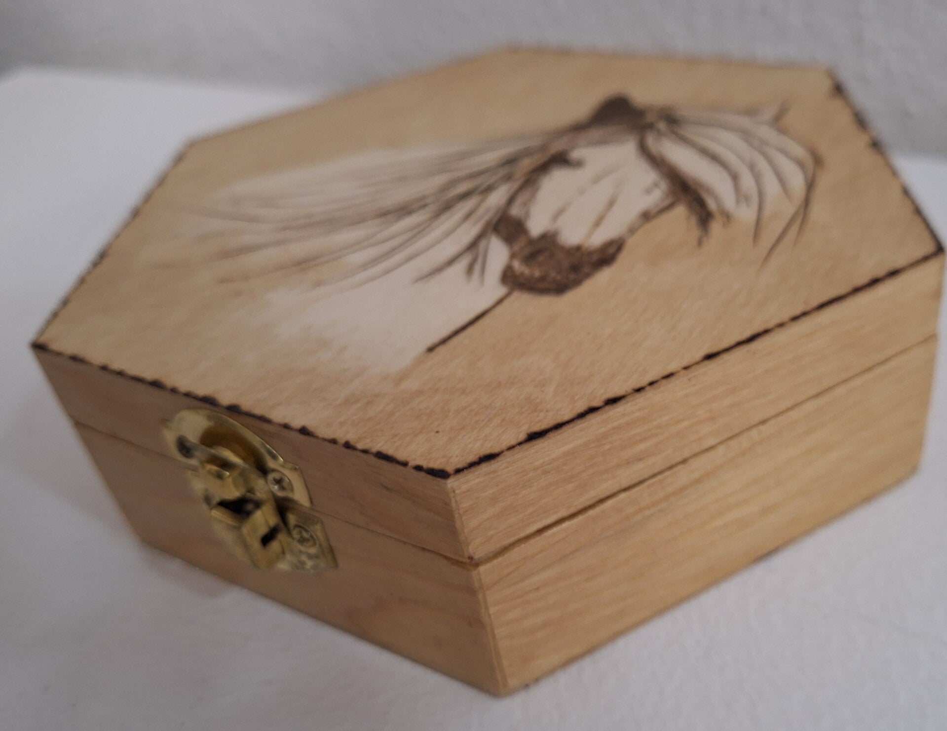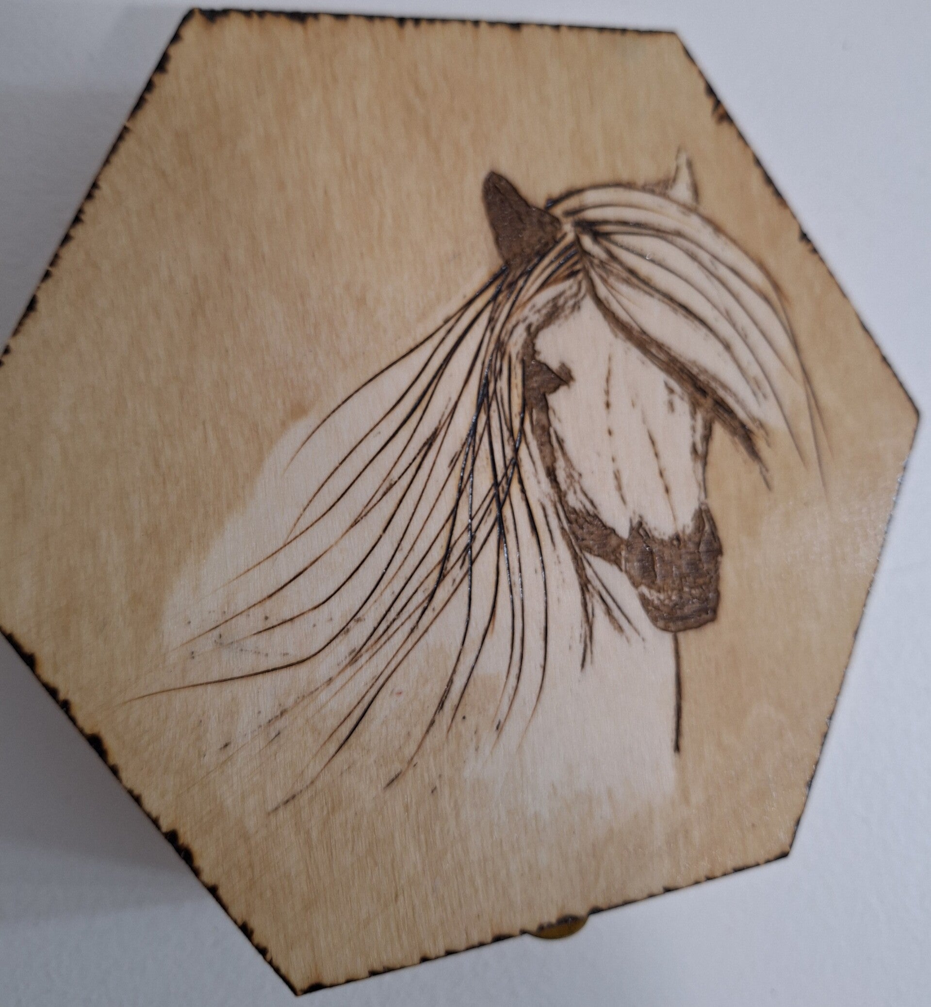 Boîte en bois de hêtre gravée d'un cheval blanc. Gravure avec un effet de relief sculpté dans le bois.Finition vernis, vitrifiéeDimension: 14 x 16 cmHauteur: 4 cm