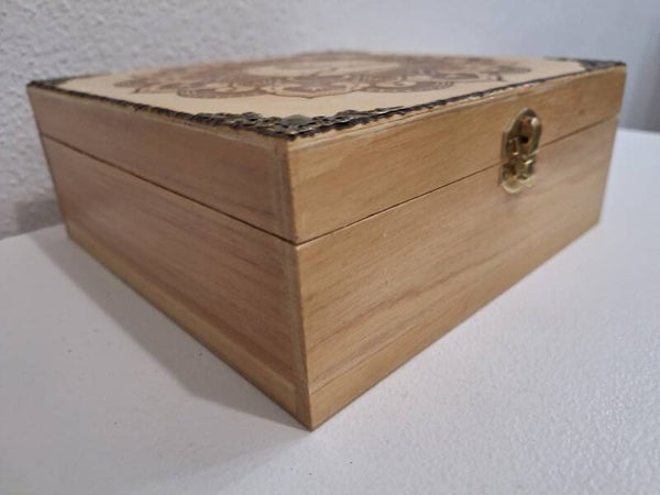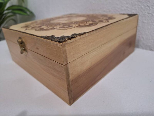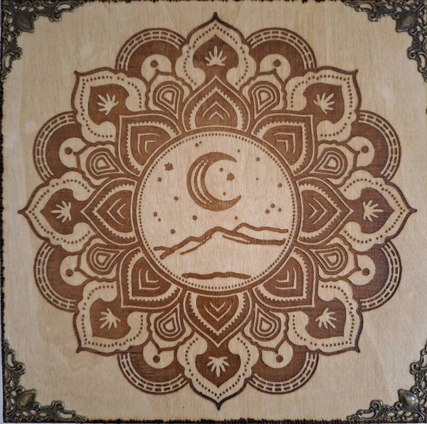 Boîte en bois gravée par mes soins de dessins orientaux avec lune étoiles dans le centre d'une fleur représentant des arabesques.