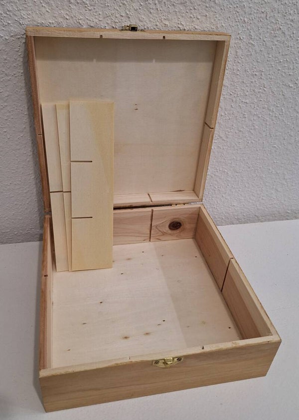 Boîte en bois gravée de dessins orientaux avec lune étoiles et fleur représentant des arabesques.