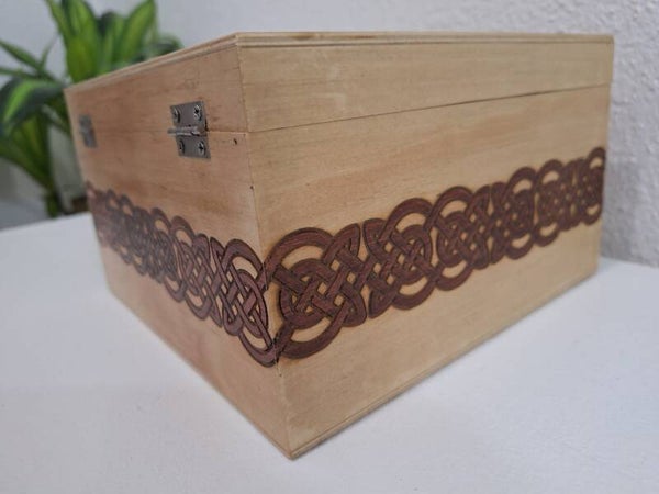 Boîte style ancienne de rangement en bois de hêtre gravée de noeuds celtiques.