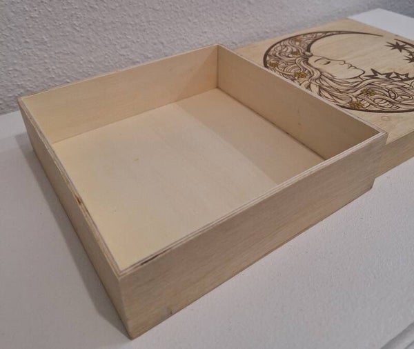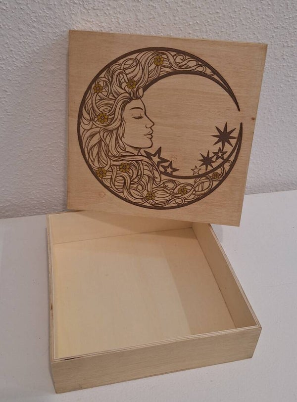Boîte carrée en bois gravé d'une lune enchâssée d'un profil féminin.