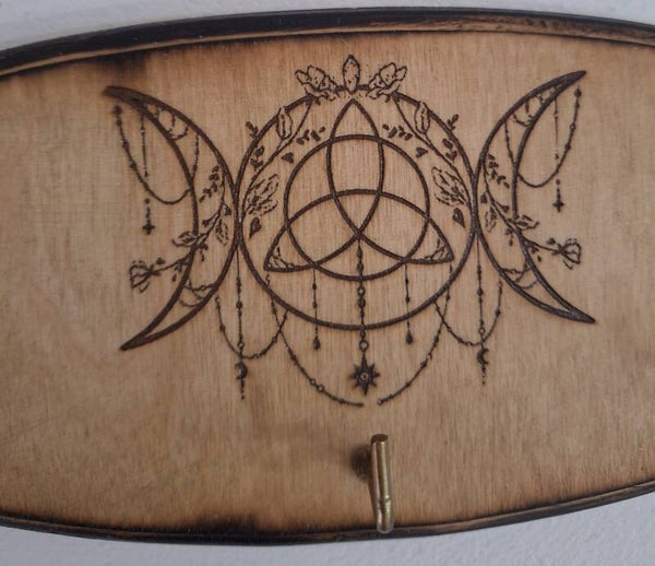 Patère mural à clefs gravée d'un triskel enchâssé dans une triple lune.