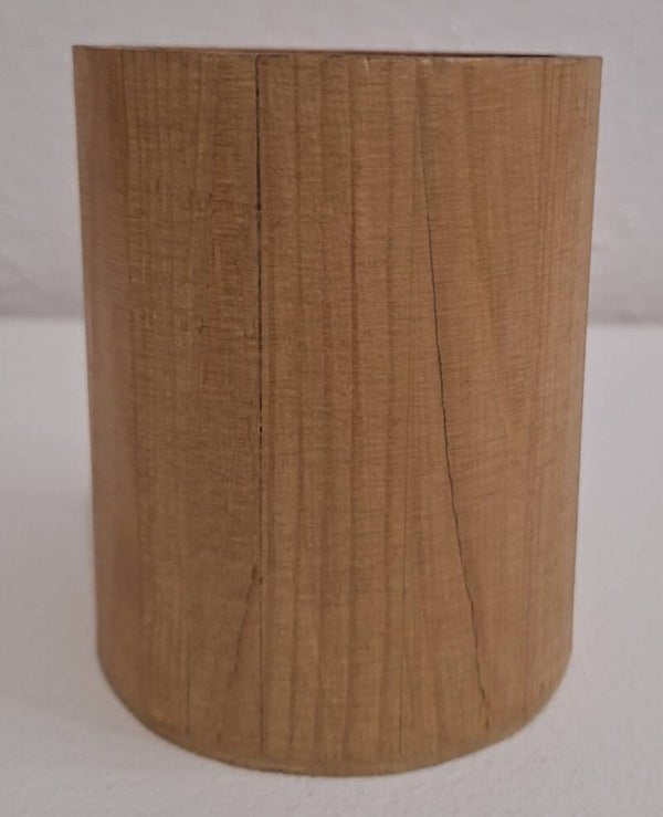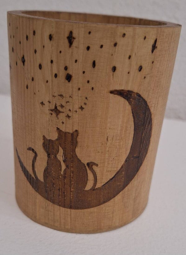 Pot en bois de conifère gravé d'un couple de chats dans un ciel étoilé.