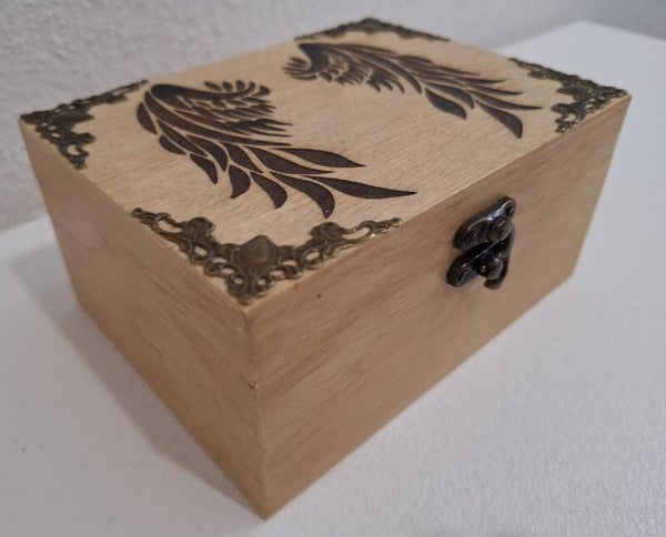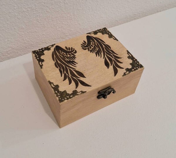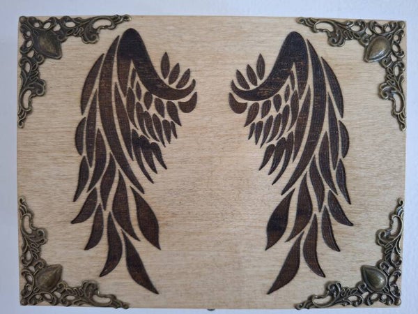 Boîte en bois de hêtre gravée d'ailes d'ange, pour y rangement vos objets religieux et/ou souvenirs. (Chapelets, custode à hostie, cartes, souvenirs de baptême, communion, confirmation, ordination de prêtre, mariage)