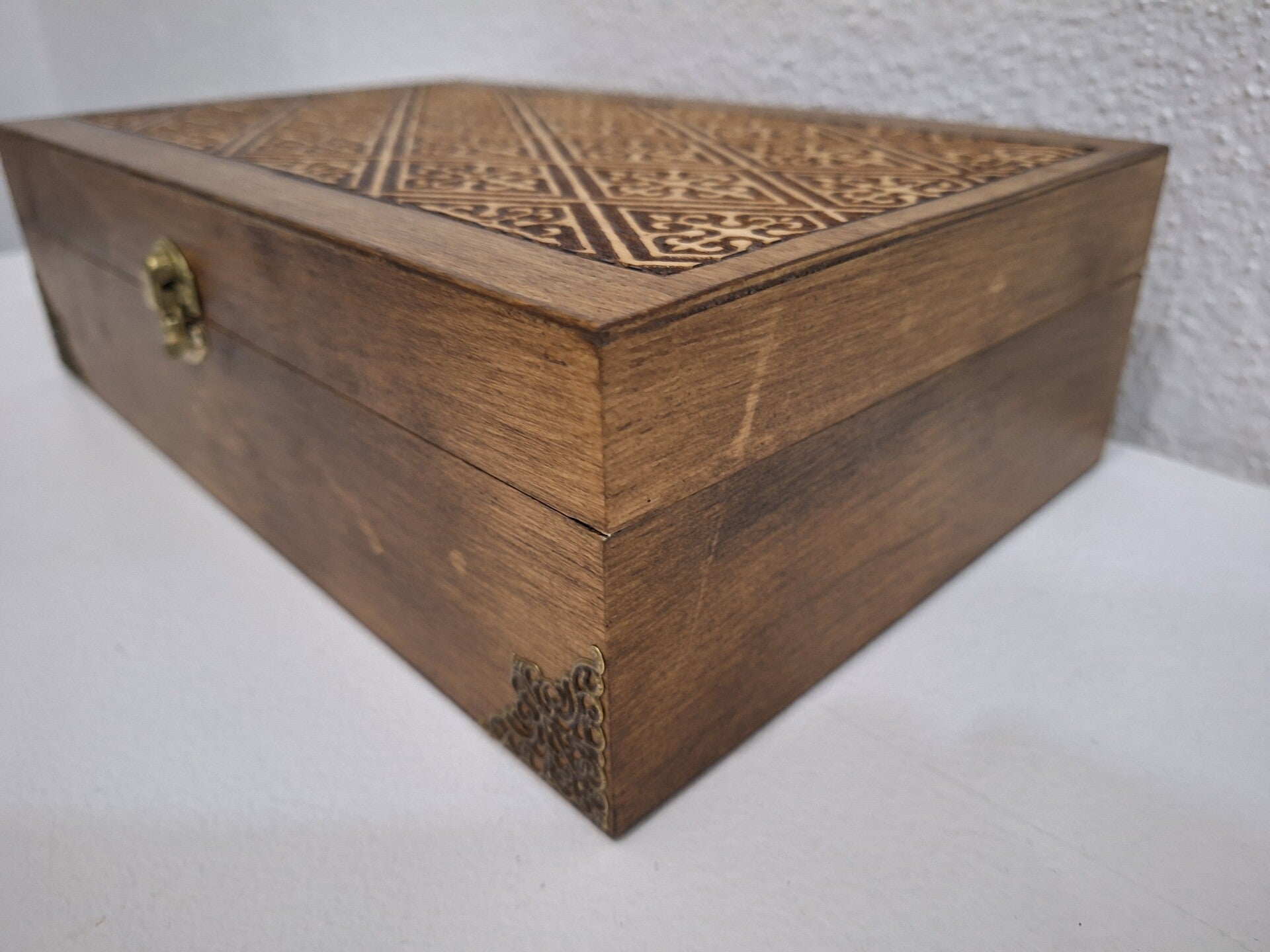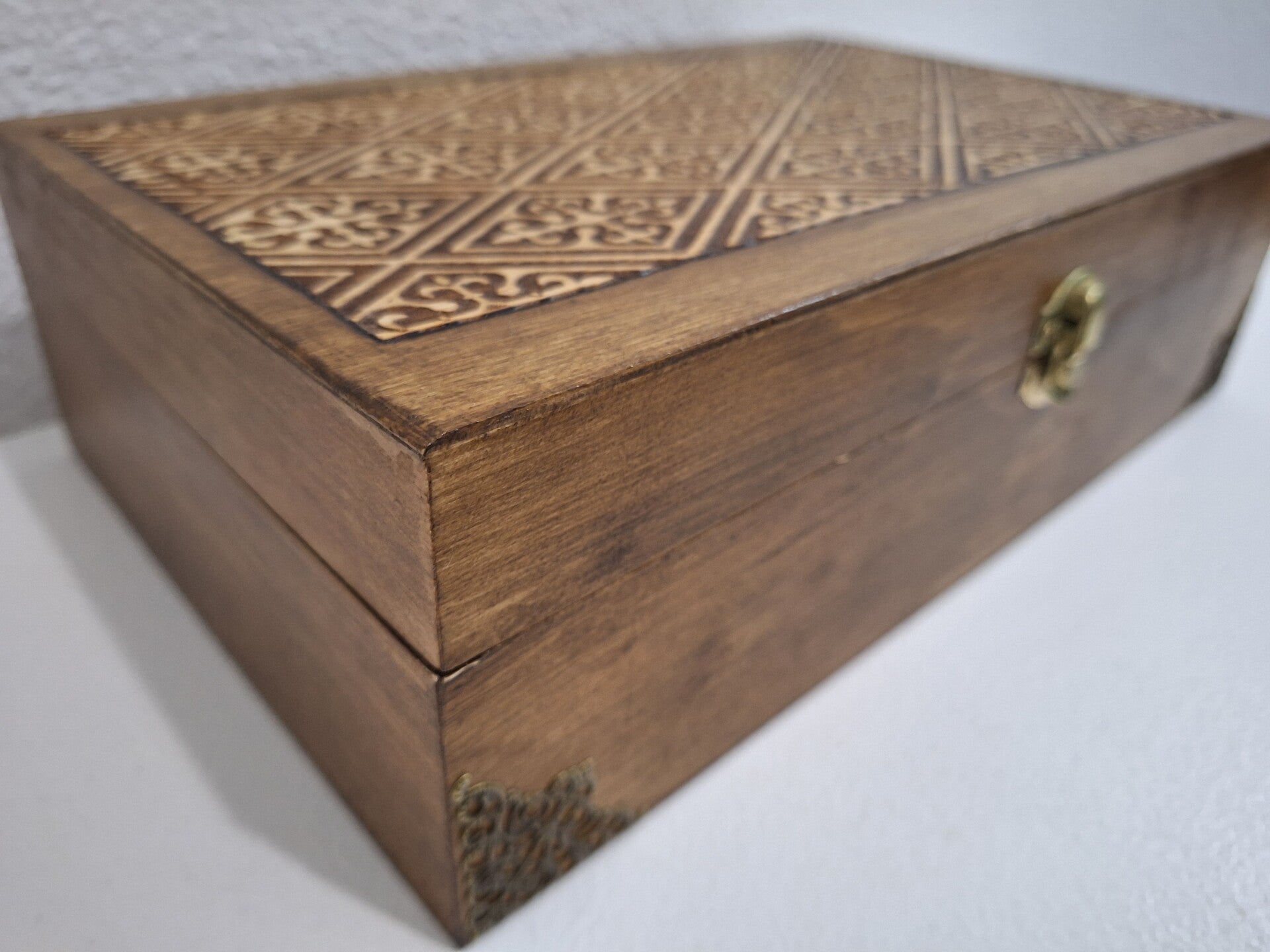 Grande boîte coffret en bois de hêtre travaillée sur un thème médiéval.