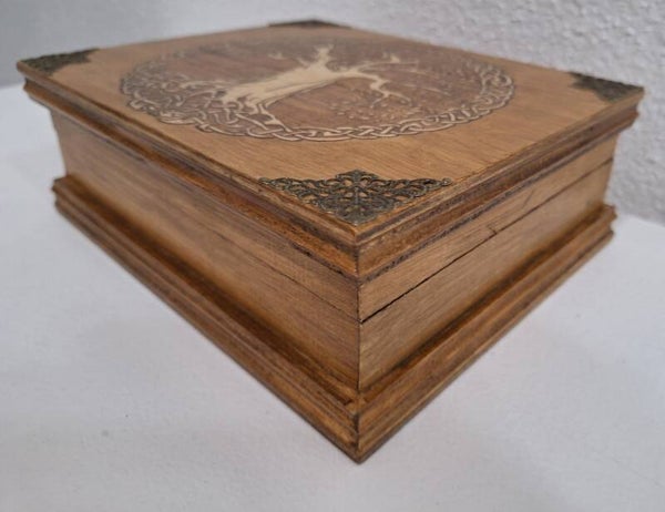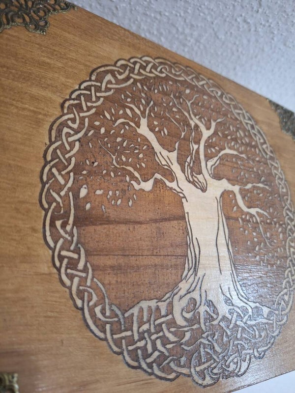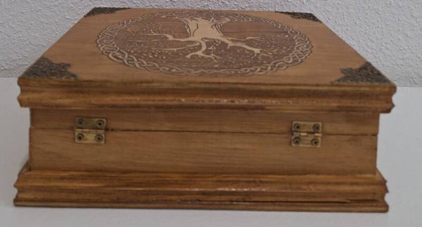 Boîte en bois gravée d'un Arbre de vie celtique couronné boite à pierres pierres cristaux bijoux huiles essentielles 5 ml