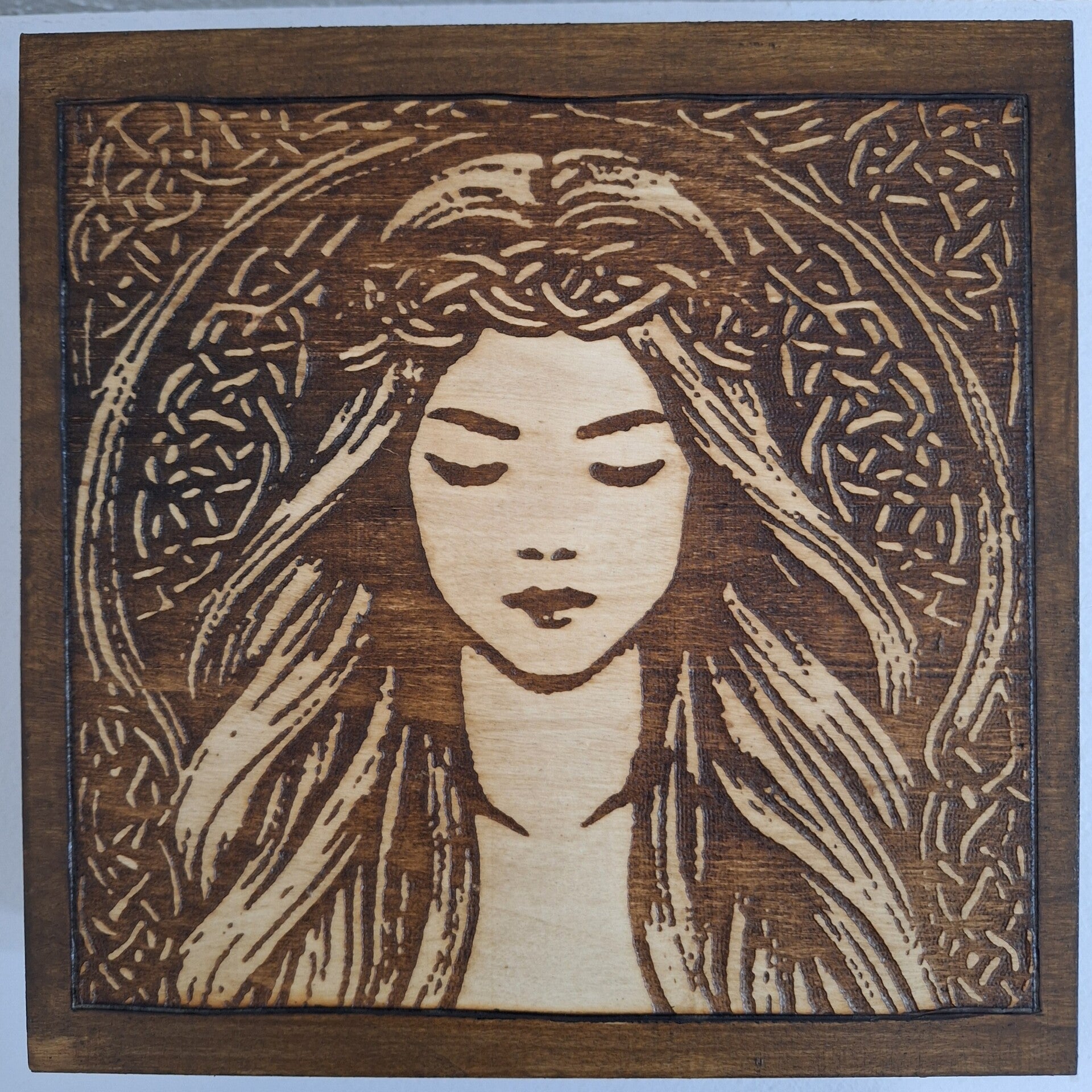 Boîte gravée en bois celte représentant Ederven une jeune fille celte.