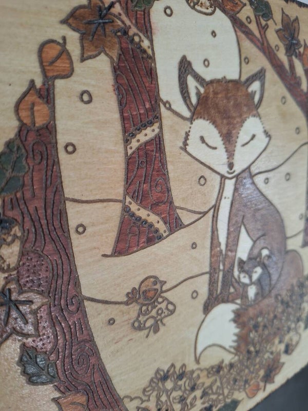 Boîte en bois gravée Famille Renard, la maman et son renardeau sous la neige automne hiver feuilles érable chêne glands champignons pour thé, couture, bijoux, rangement enfant